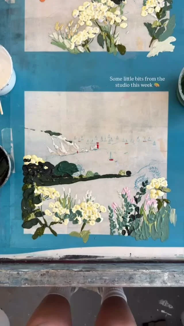 I then paint the foreground elements, like the sea, boats, buildings, and greenery, directly onto the mesh of the screen. This technique is called ‘mono screen-printing’ and lets me build up the layers of colour before pushing the colour through the mesh of the screen and onto my canvas. I repeat this process until I am happy with the colour and feel of the piece.