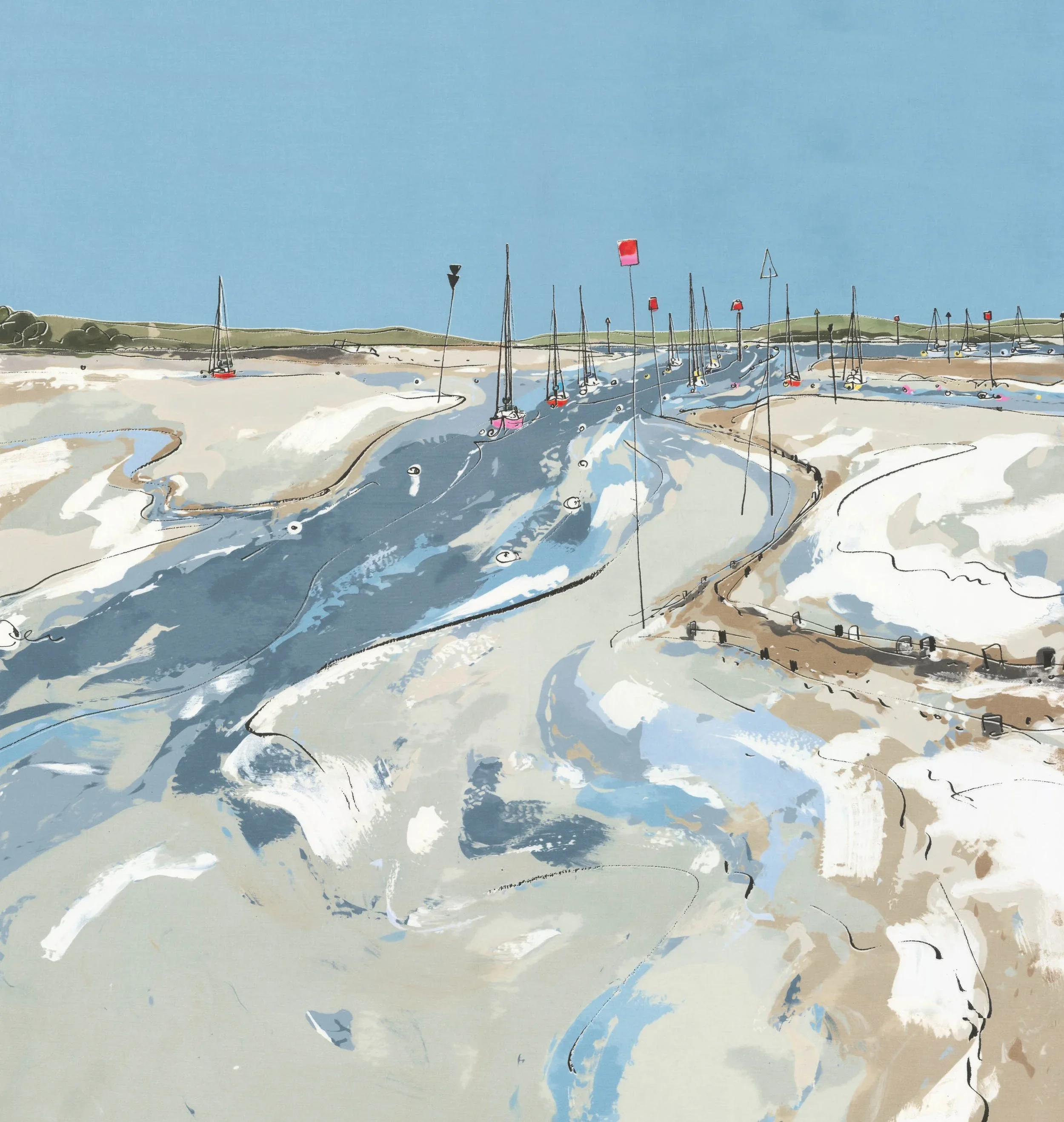 I created this piece through the family of screen print methods. I start by painting the foreground, sea, mudbanks and boats in many layers through the mesh of the silk screen which allows me to be expressive while keeping a clean crisp feel to the colour. I then screen printed the sky and my hand draw line drawing on to bring the scene and painting together.